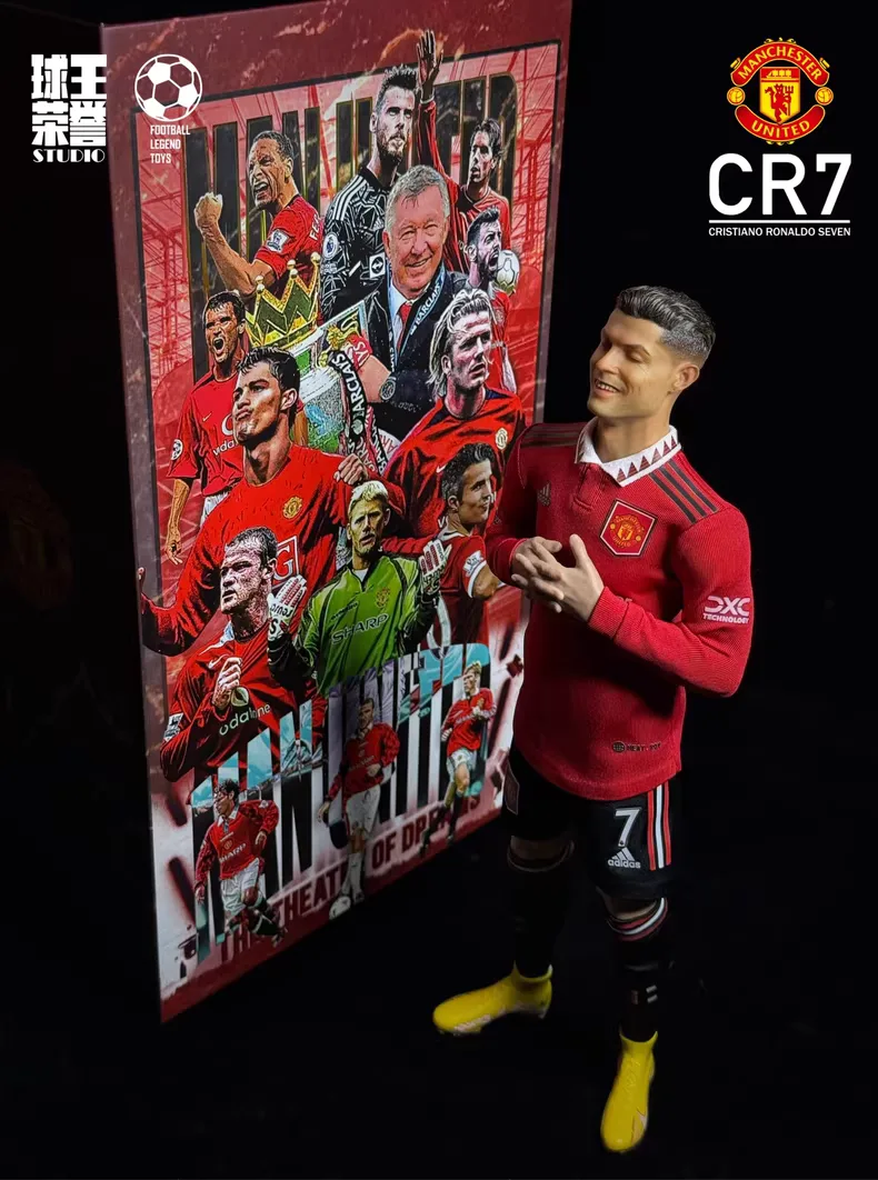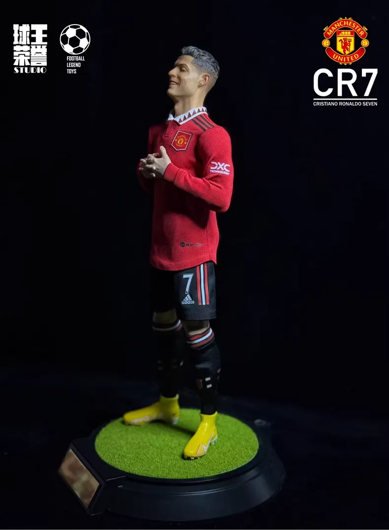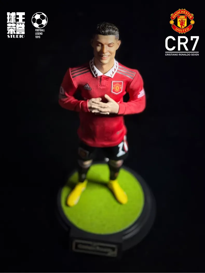 A rooted-hair 1/6 Cristiano Ronaldo figure in the Manchester United home kit in his meditation celebration pose, studio hand-painted and individually numbered for fans who love that calm, eyes-closed CR7 as much as the goals he scored at Old Trafford.